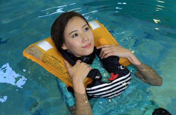 落水しても水を感知してすぐ膨張し、また膨張していなくても、固形型浮力体があるので顔面を水上